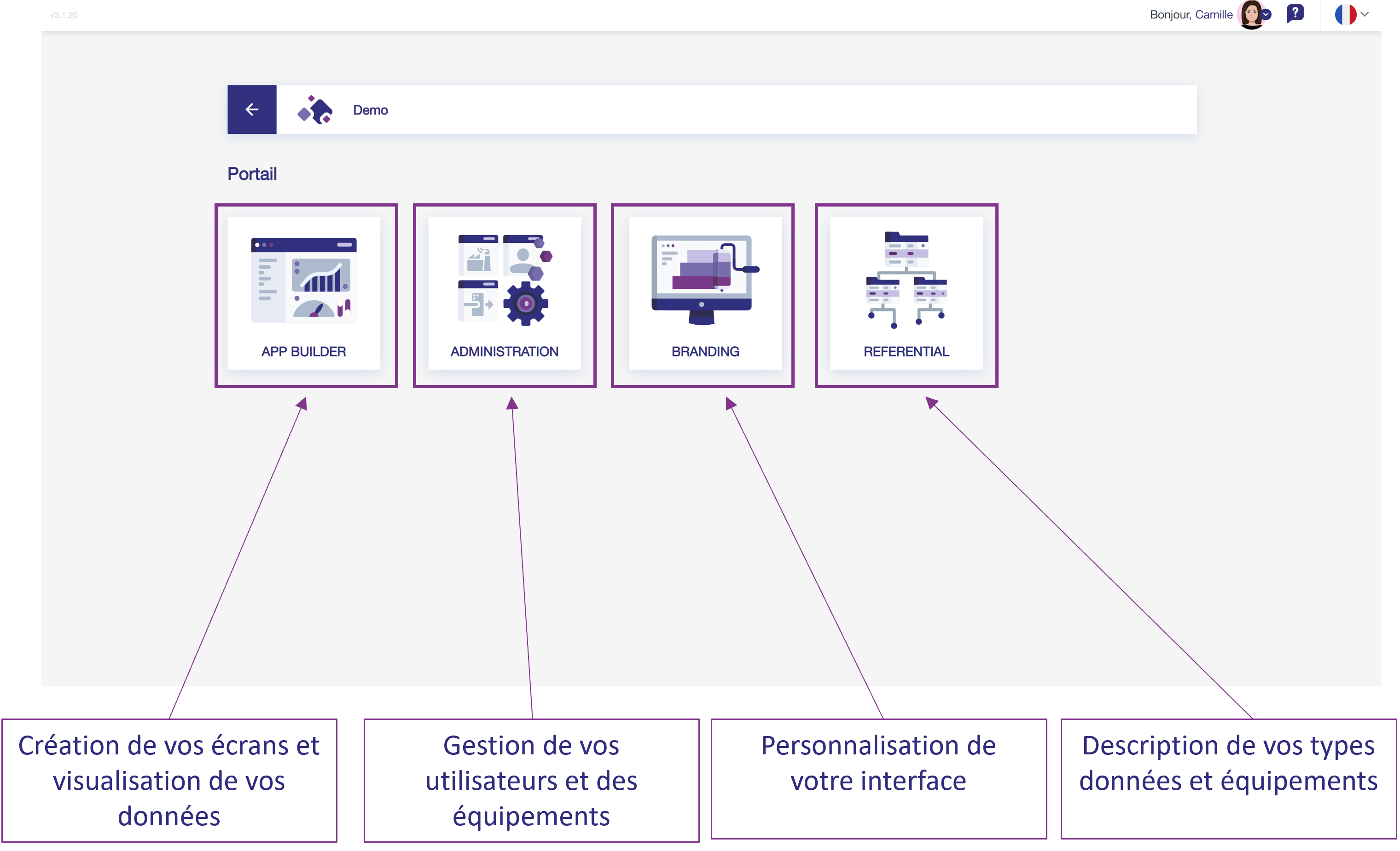La plateforme IdO s’organise en différents modules qui permettent de configurer différentes parties de la plateforme.