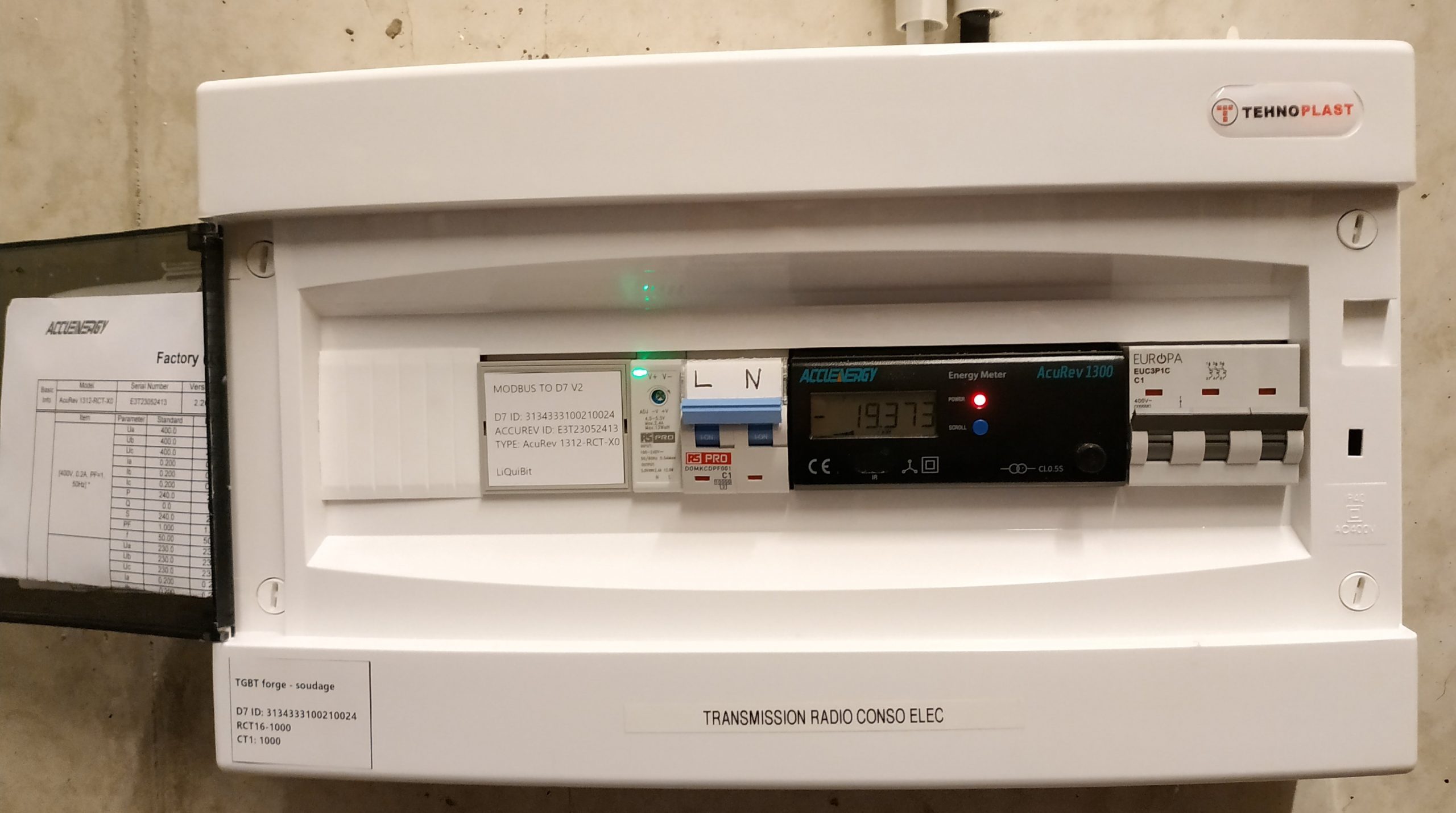 La sortie Modbus de l’énergimètre est branché à une carte avec une interface Modbus, une puce radio DASH7 et un connecteur d’antenne radio 868 MHz. Cette carte envoie les données par transmission radio à la passerelle DASH7 – Ethernet, toutes les 10 minutes :